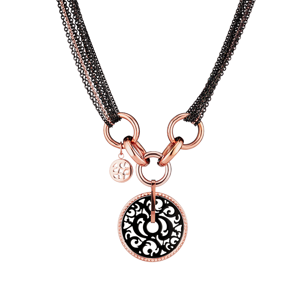 Ένα κόσμημα αποτελούμενο από πολλές λεπτές αλυσίδες μαζί σε 2 αποχρώσεις, διακοσμημένο από ενωμένους κρίκους που έχουν τη δυνατότητα να ανοίγουν προκειμένου το κολιέ να μπορεί να φορεθεί και ανοιχτό και κλειστό. Χαρακτηριστικό στοιχείο αποτελεί το κεντρικό charm, σε εντυπωσιακό μέγεθος, που απεικονίζει το διάτρητο μοτίβο της “Volcanic Rock” συλλογής!