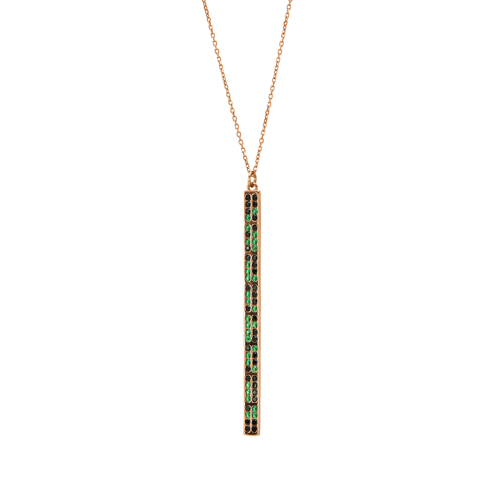 Μακρύ ασημένιο κολιέ με λεπτή αλυσίδα σε ροζ χρυσή επιμετάλλωση, από τη συλλογή “Goth”. Το στοιχείο στο κέντρο σχηματίζει μια γραμμή, η οποία εντυπωσιάζει χάρη στον όμορφο χρωματικό συνδυασμό που δημιουργούν τα μαύρα και τα πράσινα ζιργκόν.